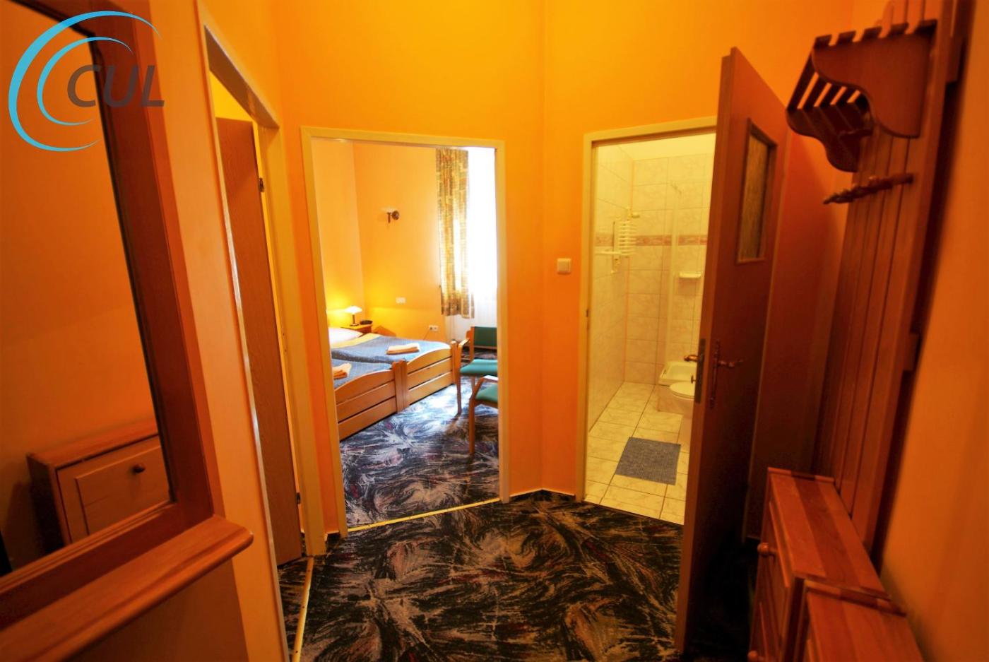 Duży pokój dwuosobowy. Ten pokój dysponuje łazienką i wyposażony jest w telewizor. Pokój Dwuosobowy - 3 osobowy. Powierzchnia pokoju ok.: 25 mkw. ;